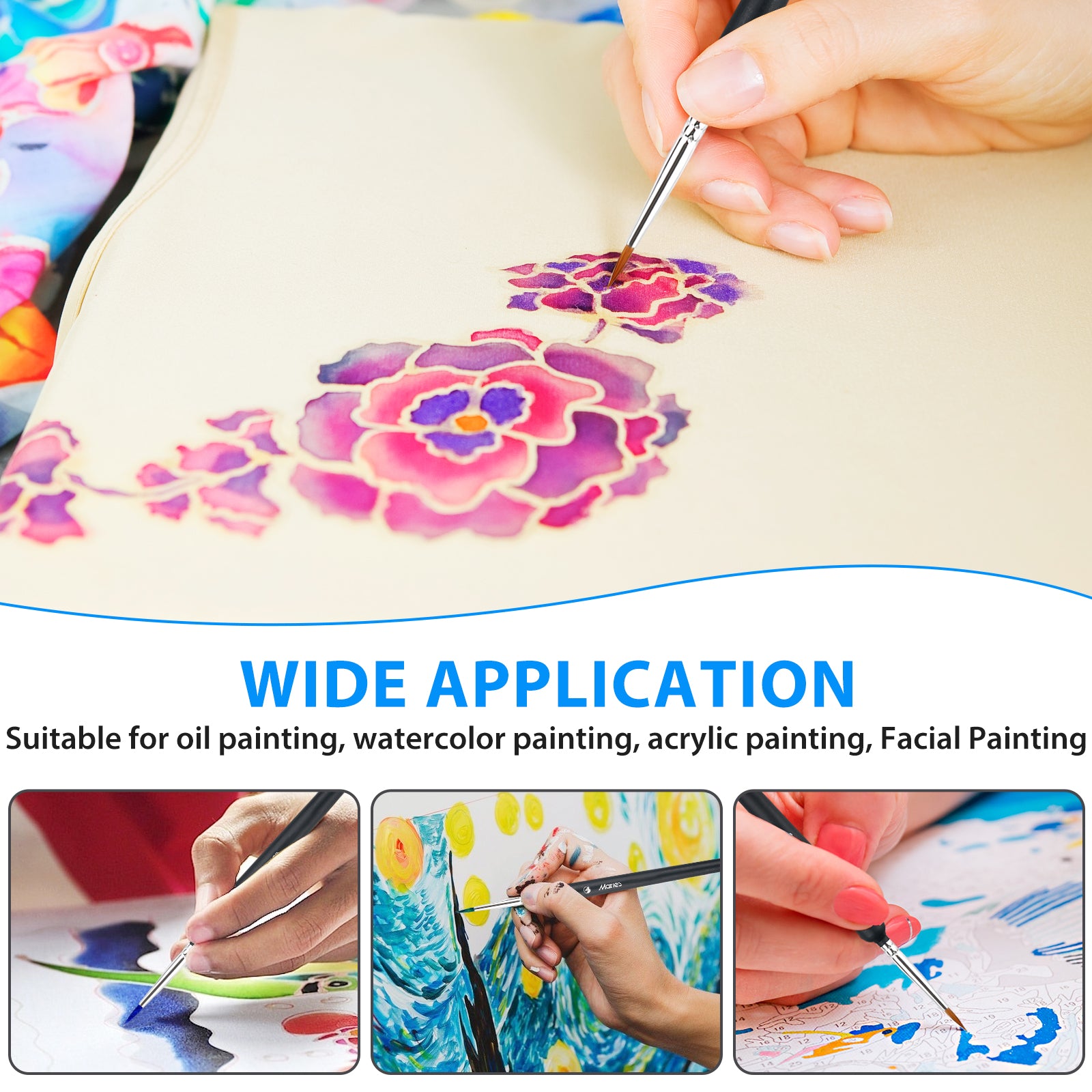 It has always been the mission of EEEkit to save money for customers and provide good products. This artistic miniature brush set has 9 combined nibs of different thicknesses, including multiple models of 000/00/0/1/2/3/4/5/6. Allows you to meet your various needs when painting. This delicate brush is of high quality. It has good elasticity, soft bristles, strong water absorption, and neat stacking. No hair splitting or falling out. It is not only helpful for positioning and long lines when drawing, but also allows you to accurately grasp the details of the drawing. Even after washing and using it many times, the acrylic paint brush still maintains its shape well. In addition, the handle of the miniature brush is exquisitely designed and comfortable to hold, and it is also coated with an anti-ultraviolet coating. Even painting for a long time can be easily controlled, reducing hand fatigue. Each brush has a seamless nickel ferrule that will not rust or crack, which can firmly hold the sable hair in place and will not crack or fall off easily. The fine detail brush set is very suitable for any detail painting. These detailed brush sets are very suitable for artists, students, professionals and beginners to use in artistic painting, gouache, acrylic, watercolor, oil painting, miniatures, models, nails, etc. If you also love painting, don't miss our 9PCS miniature brush set.