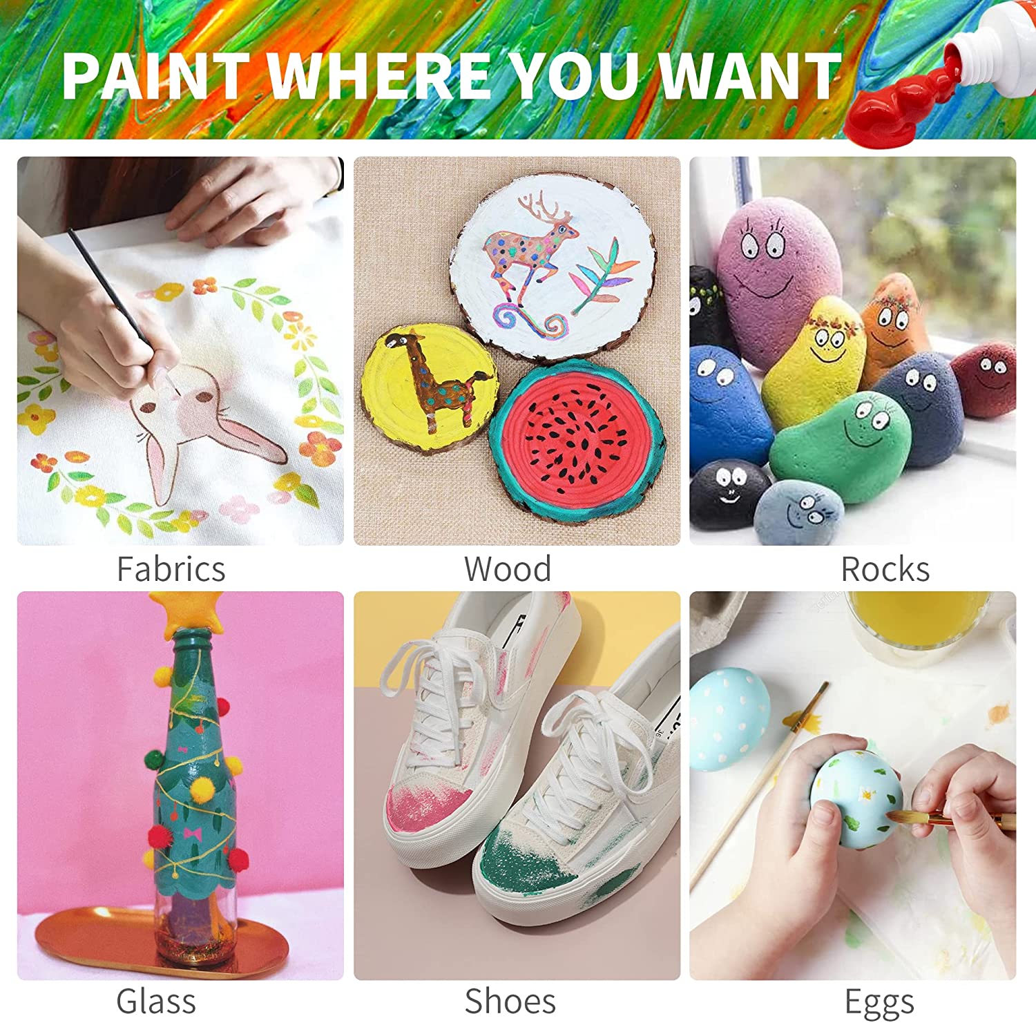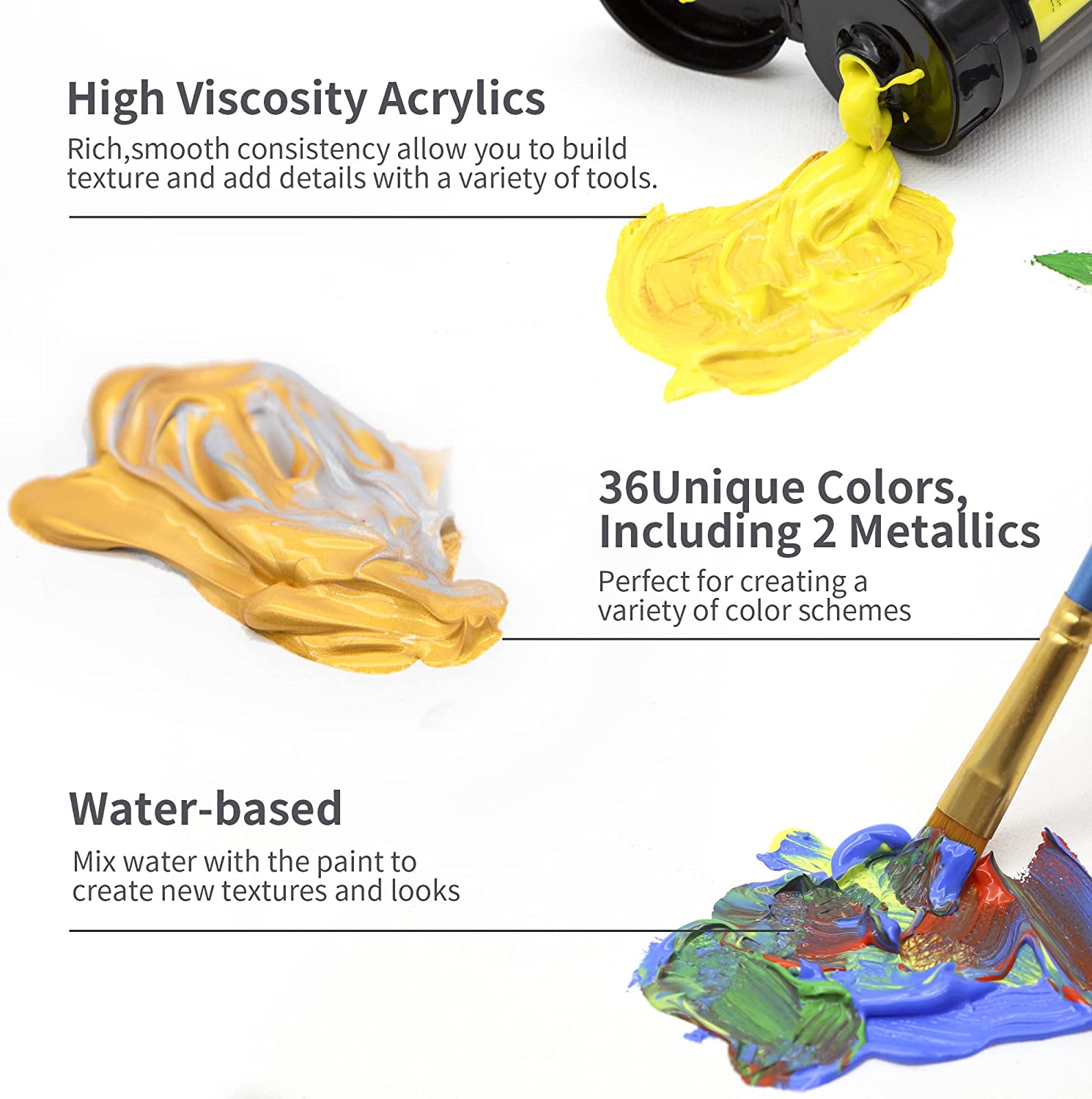 This set of acrylic paints includes 36 vibrant colors. Each tube contains 22 ml (0.73 oz) of high quality, pigment-rich coloring pigments. Made of high quality materials and finished with non-toxic formula to protect the user in all aspects. Suitable for people of all ages and for most paintable surfaces. No need to worry about the display of the painting effect, our acrylic paint set paints realistic, consistent tones and vibrant colors to give you the best painting experience. Easy clean up process, just use soap and water when wet.