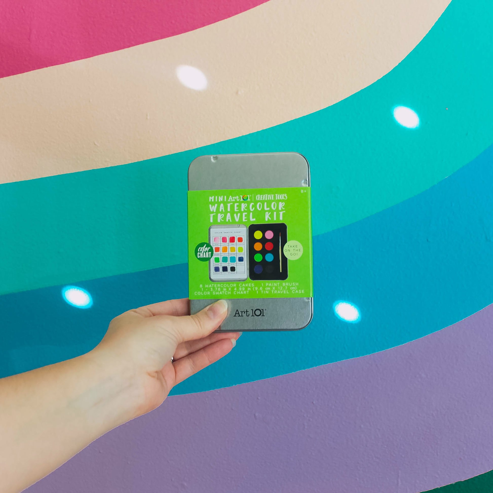 Art 101 Creative Tools Mini Watercolor Travel Kit includes a variety of 8 vibrant watercolor cakes that are perfect for all of your watercolor endeavors! Perfect for easy storage or to take with you on the go, this kit comes in a handy and convenient travel size tin. With a paint brush included, this is the perfect item for any artist 8+ of any skill level to keep handy for whenever inspiration may strike.