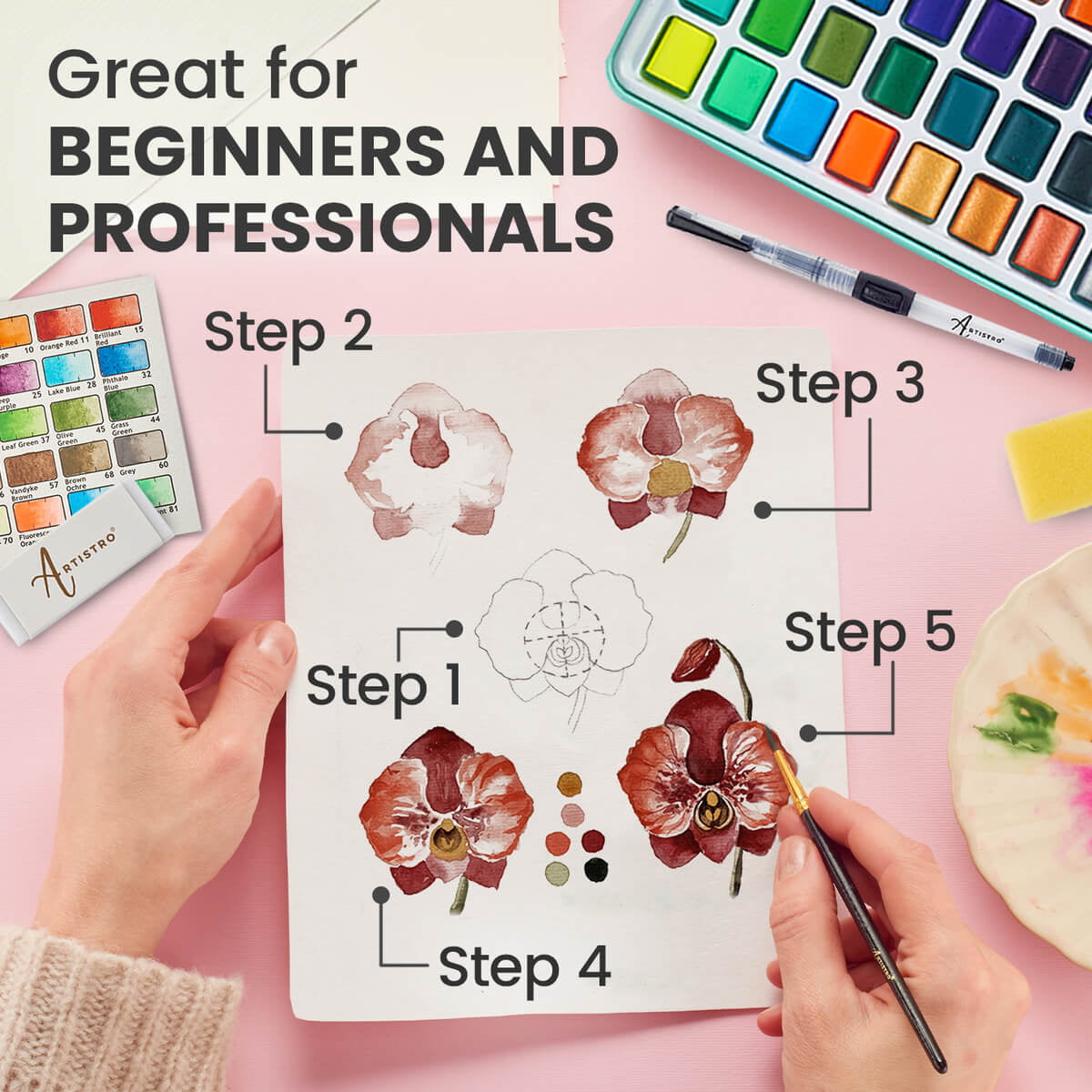 Make your watercolor art come to life with vibrant colors. This professional watercolor paint set was designed for both beginners and pros. These watercolor paints are ideal for coloring books, bullet journaling, sketching, lettering, and more.