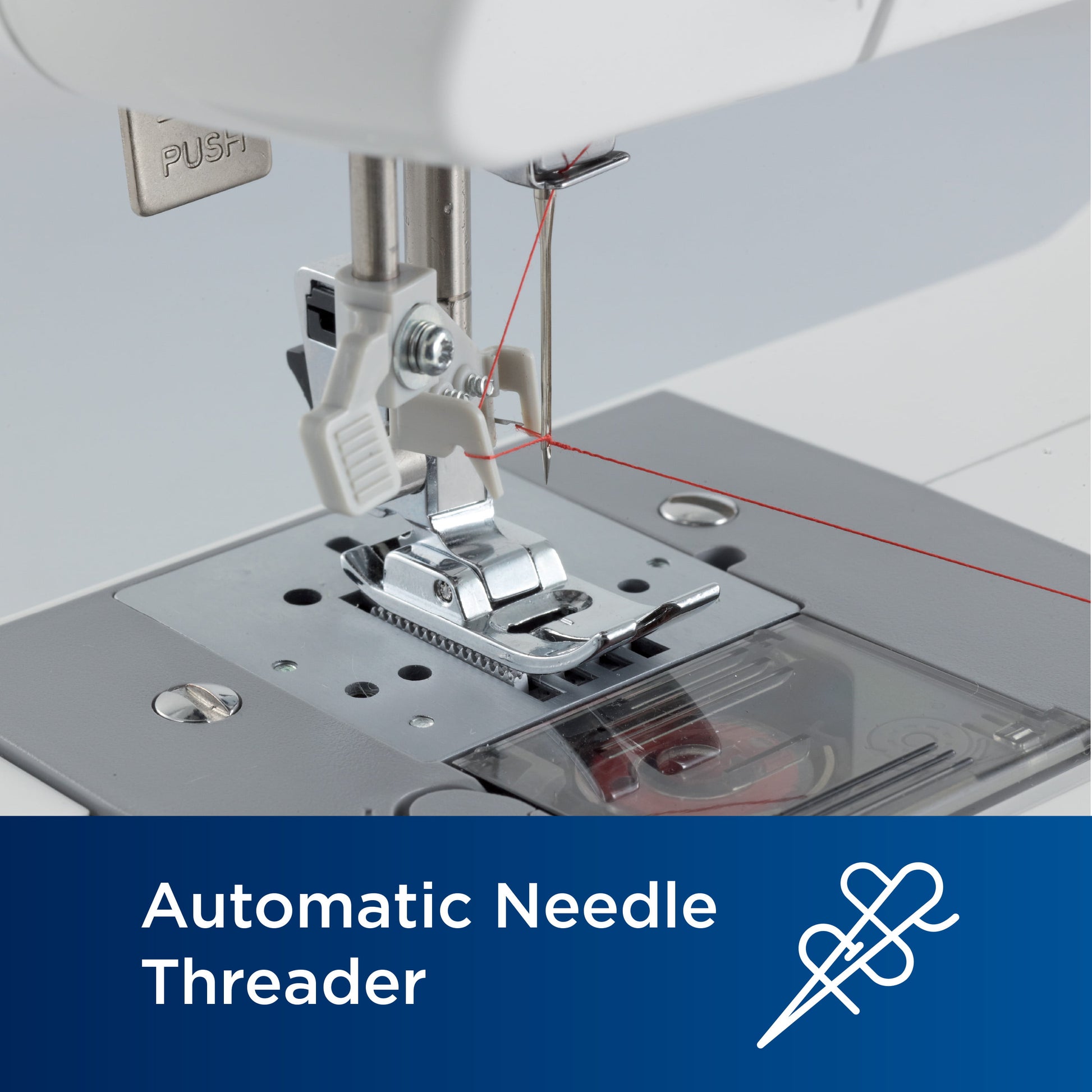 - Automatic needle threader and drop-in top bobbin: This sewing machine includes an automatic needle threader that perfectly pushes thread through the needle and a convenient, jam-resistant drop-in top bobbin