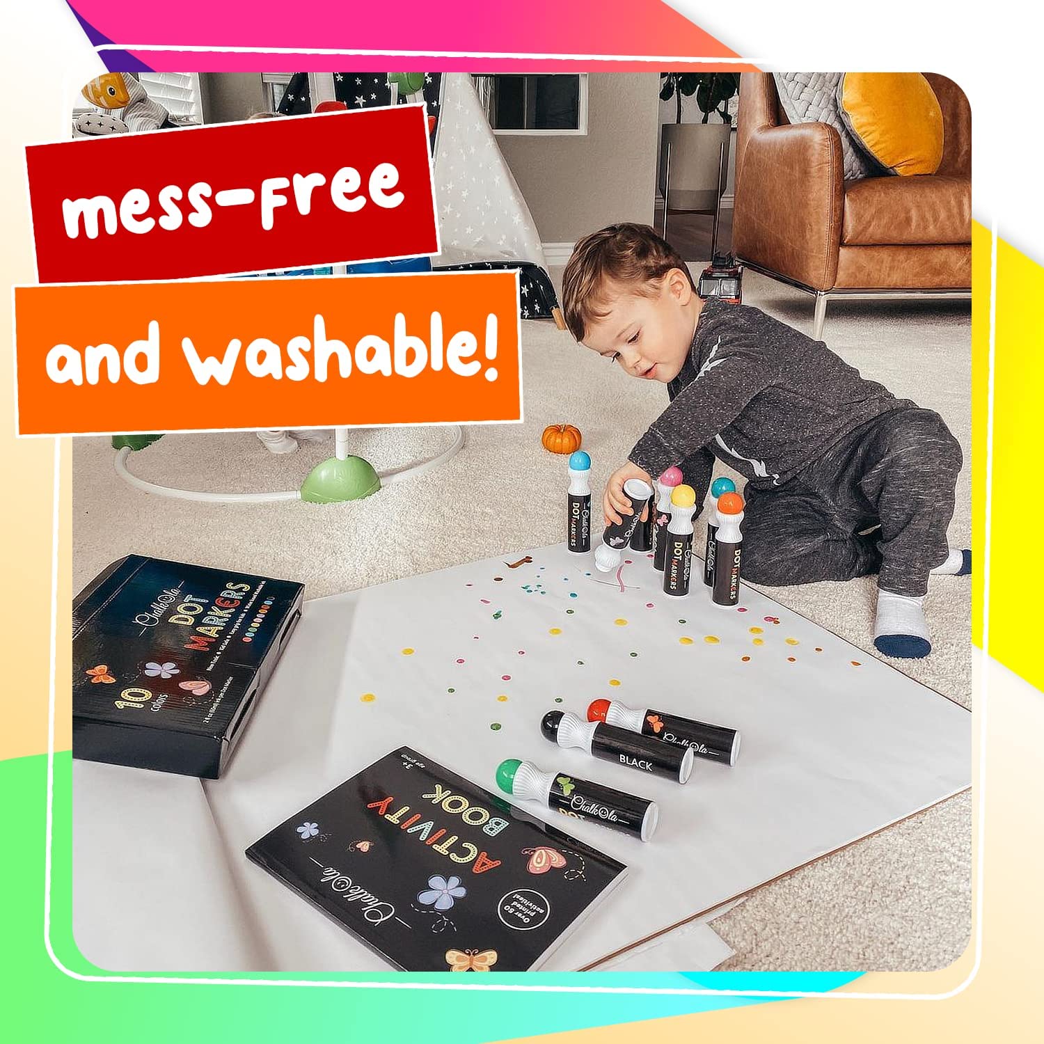 - Completely Mess Free: No dealing with ink leakage. No dealing with paint that’s a nightmare to clean. These doadot markers have water based ink that easily washes off clothes and hands and is 100% non toxic to keep the kiddies perfectly safe.