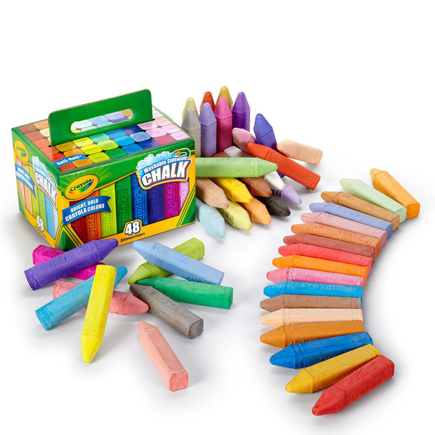 • A safe and convenient choice for kids, this chalk has a special anti-roll shape to prevent it from rolling down driveways or other inclined surfaces. • Crayola Washable Sidewalk Chalk washes clean from sidewalks and driveways. For fast and easy cleanup, use a water hose to spray away the color. • This set includes a diverse range of assorted colors.