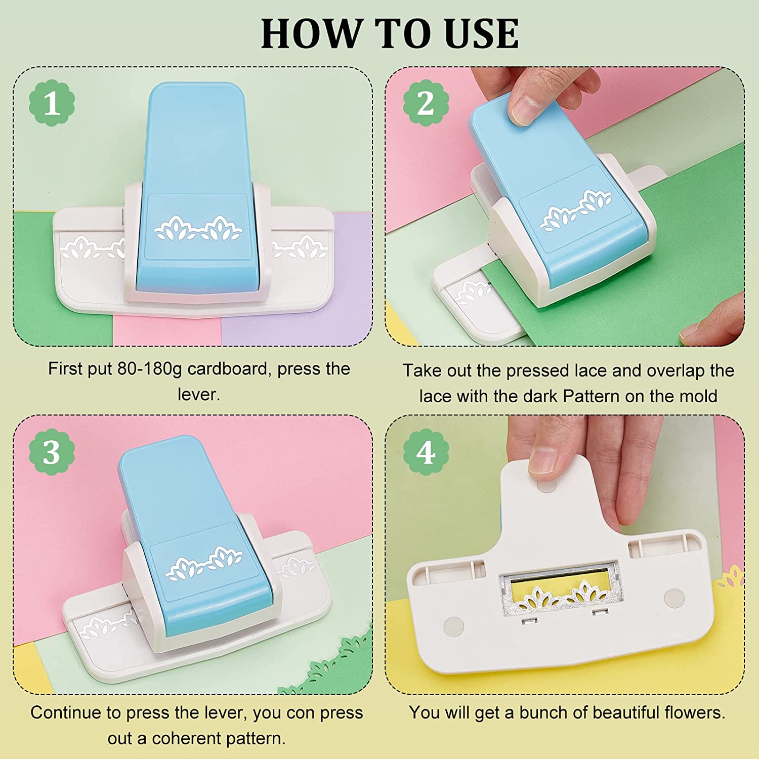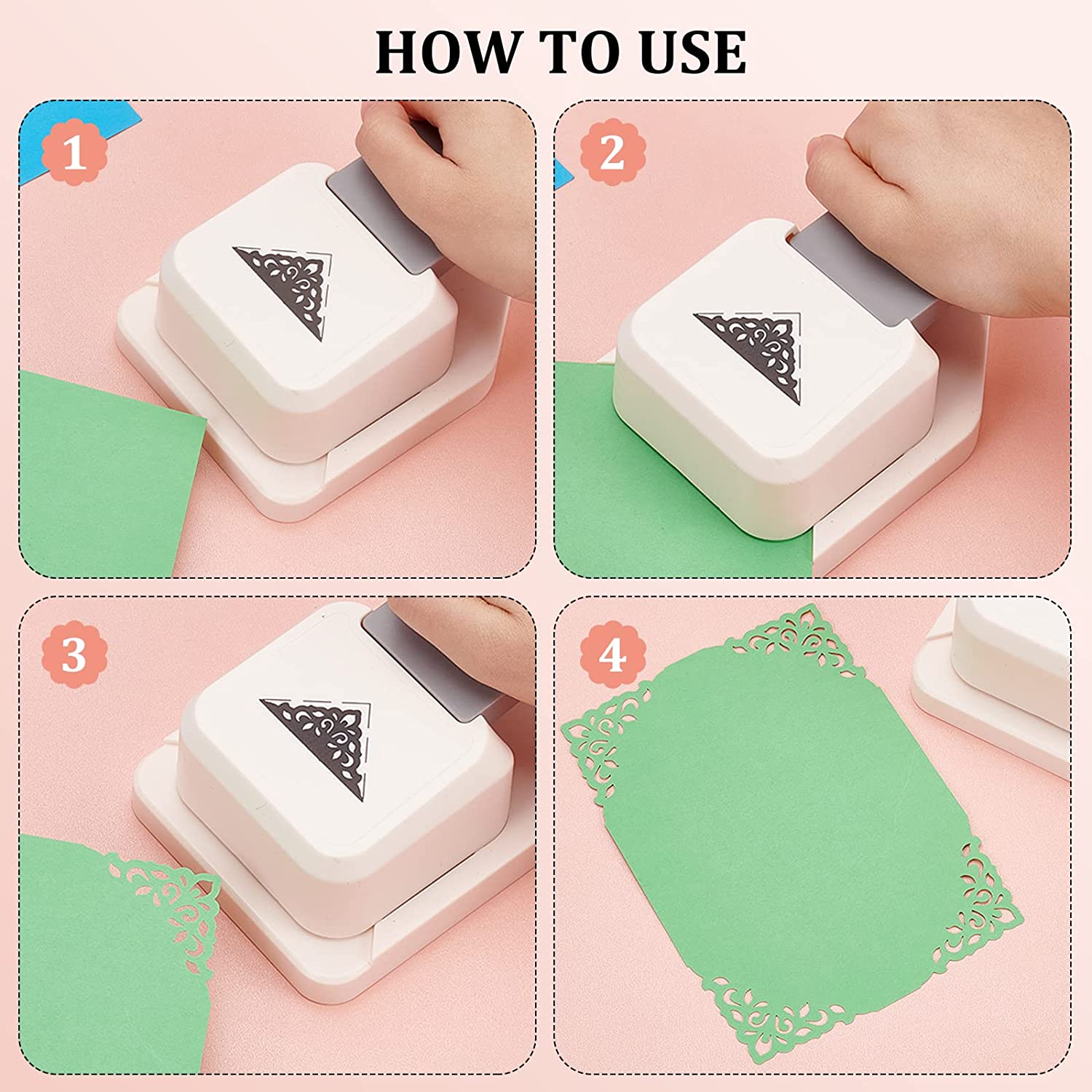 - 【Easy to use】: Make sure the edge of the paper to be cut is flat and smooth, put the corner of the paper on the embosser and press it easily. (Please do not use thick cardboard and sticky paper to avoid punching jams).