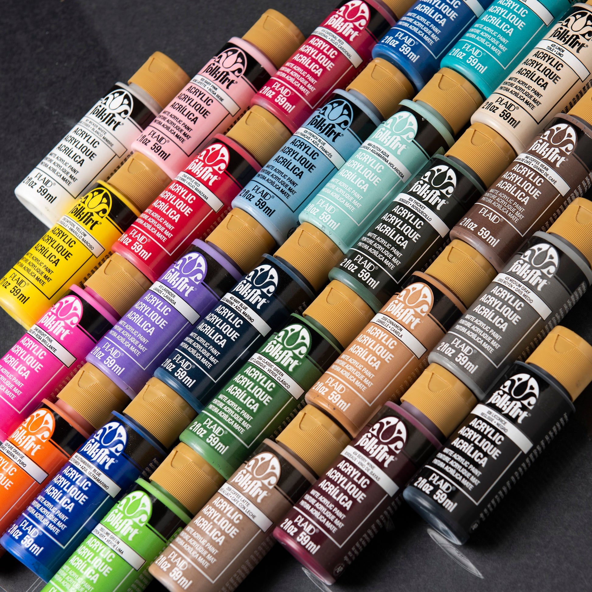 - Colors included in this kit 2 fl oz bottles of: FolkArt Acrylic Wicker White, Baby Pink, Bright Pink, Apple Red, Cardinal Red, Berry Wine, Pure Orange, Daffodil Yellow, Classic Green, Thicket, Lime Green, Dutch Aqua, Aqua, French Blue, Ultramarine Blue, True Blue, Navy Blue, Lavender, Coffee Latte, Cinnamon, Linen, Medium Gray, Coffee Bean, and Licorice.