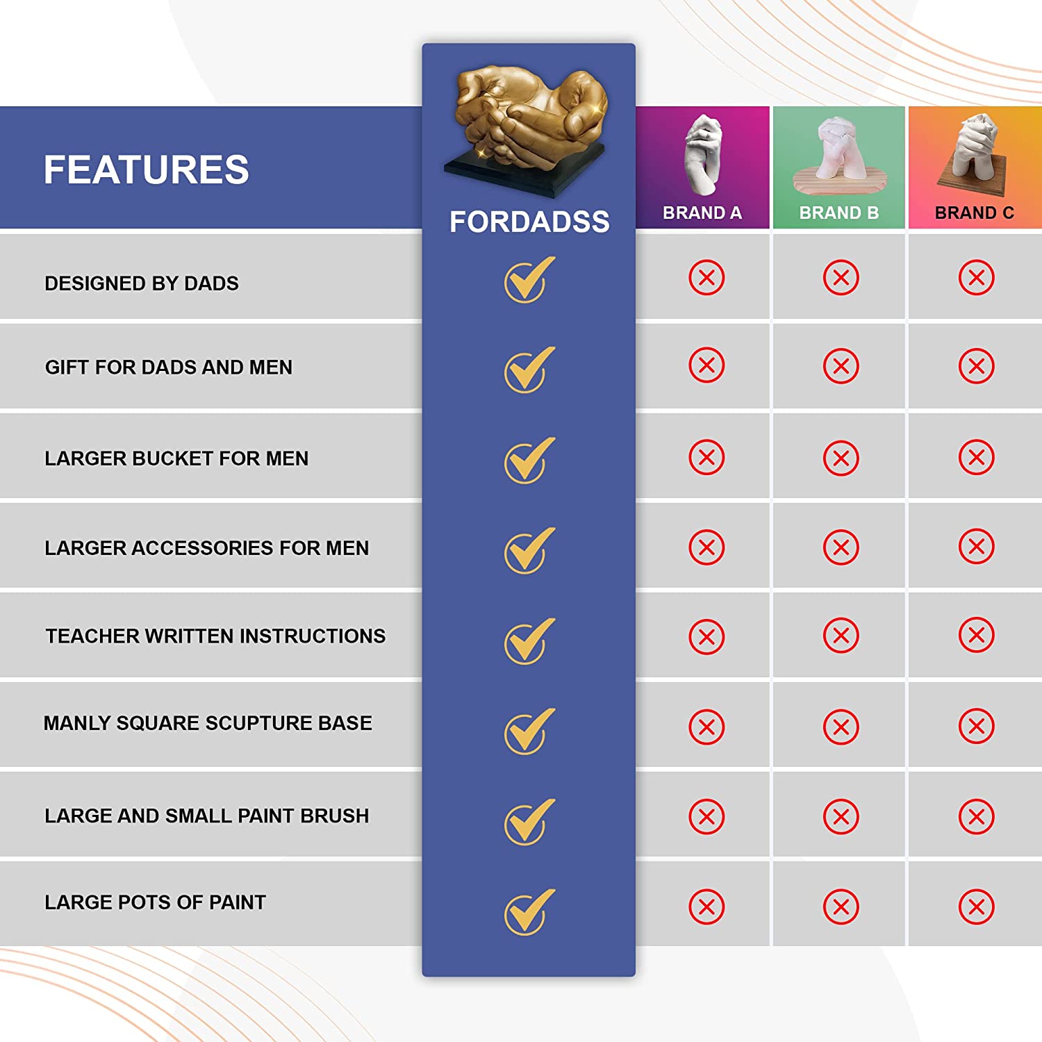- 🎉【CONTENTS】The only most comprehensive kit designed for Dads and Men – Included in your Dad Kit: Wider and larger Molding Bucket than others, Premium Alginate Molding Powder, Premium Casting Stone Powder, Practice Kit (50g Premium Alginate Molding Powder + 50g Premium Stone Casting Powder) De-molding Stick, Fine and Course Sandpapers, Fine and Large Paintbrushes and large Gold and White Acrylic Paints, Wood Base, Plastic Tablecloth, Gloves, Protective Face Mask, Safety Pin, and Floss Pic k