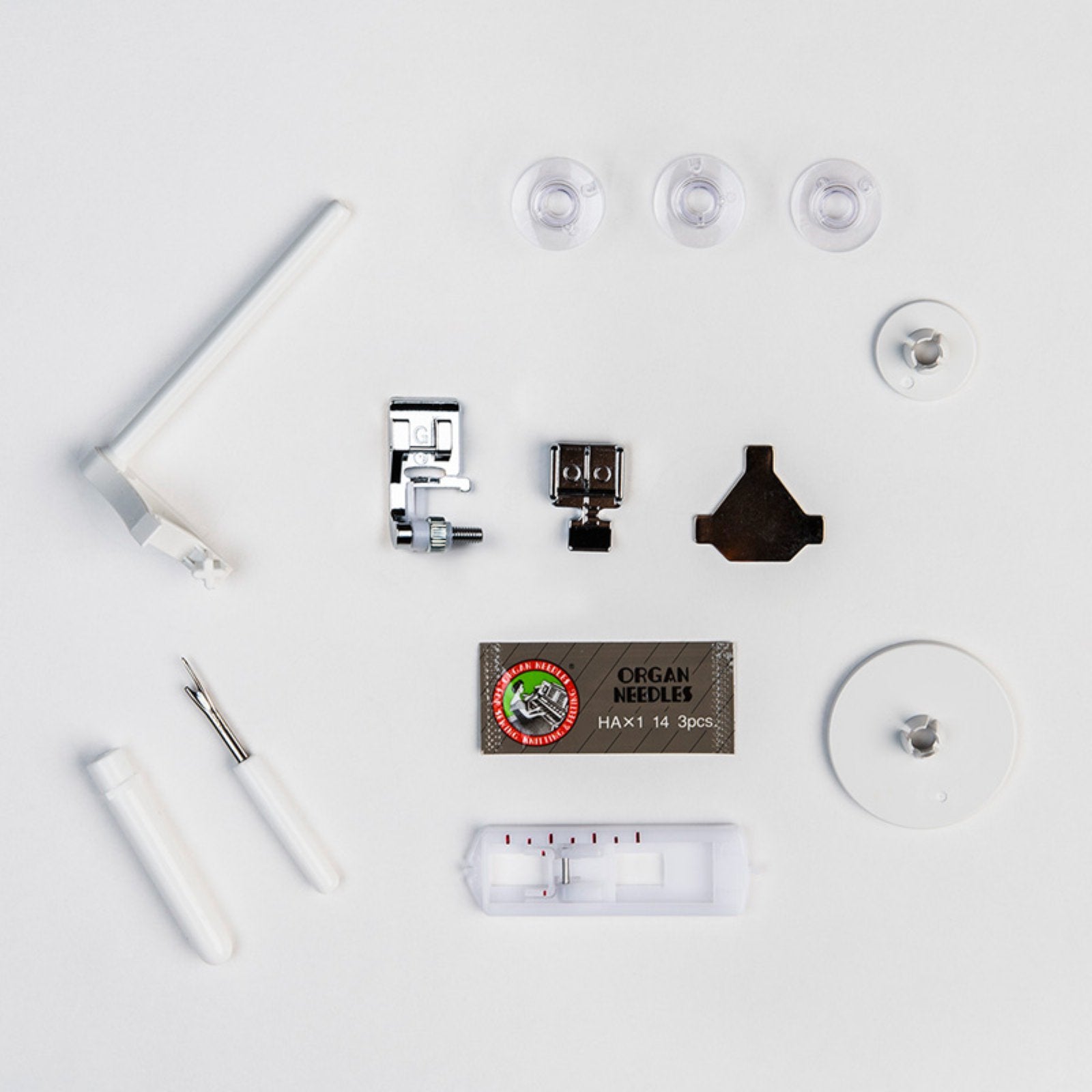 - Free Accessories Included: General Purpose Foot , Zipper Foot, Blind Hemming Foot, Sliding Buttonhole Foot, Spool Holders (Large and Small), Extra Spool Pin, Bobbins (class 15), Assorted Needle Set, Seam Ripper (Buttonhole Opener), Screwdriver, Instruction Book, Dust Cover, Foot Control, Power Cable