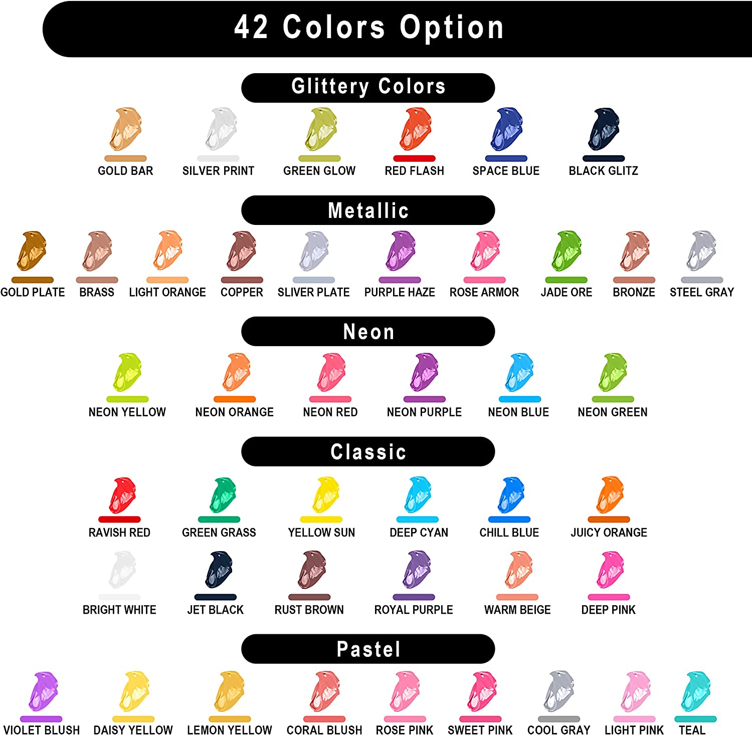 - PREMIUM PIGMENT TEXTURE PAINT: Our tempera paint set for kids includes 42 rich colored paints with 5 exciting textures of classic, neon, pastel, metallic and glitter color paints.This fantastic window paint has a crackless and flakeless texture after painting.Our hand craft paint is perfect for parent-child play time and a great essential kit for any arts and crafts paint project.