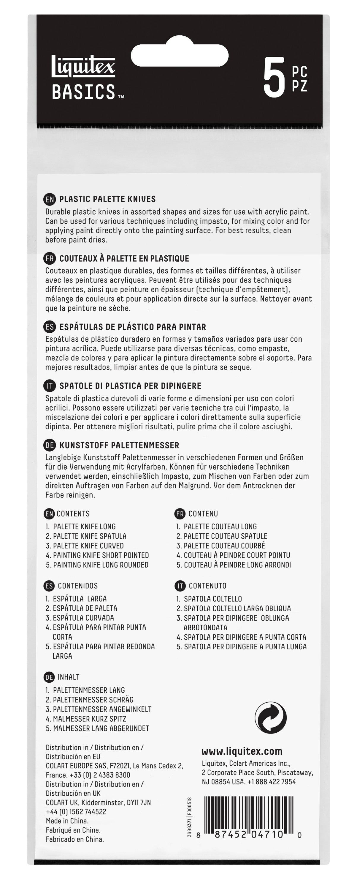 Designed for various techniques including impasto, color mixing and applying paint directly to the surface. This set includes one each of long, spatula and curved palette knives and one each of short pointed and long rounded painting knives.