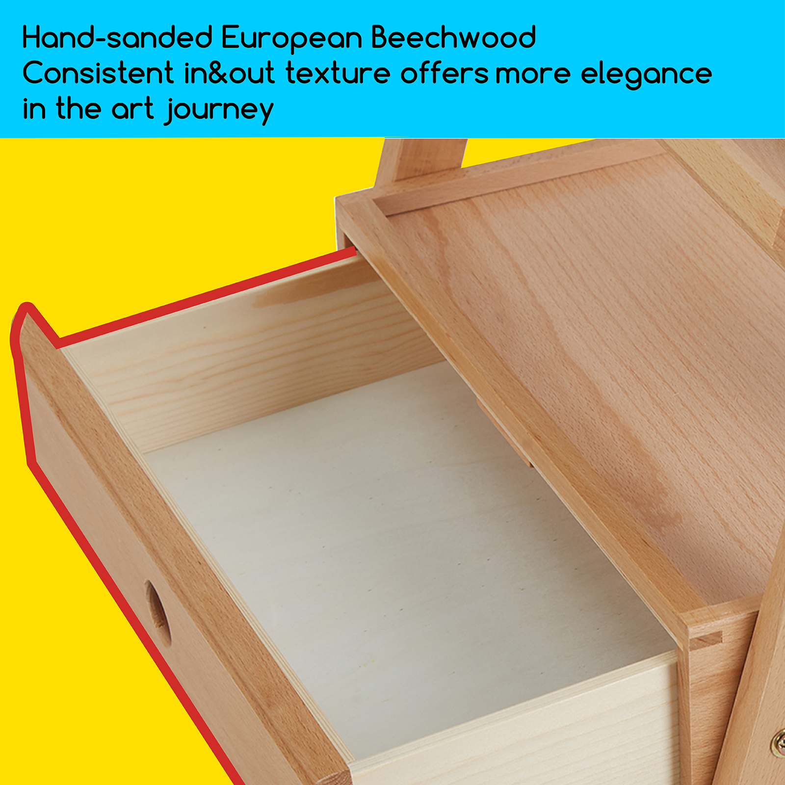 Revolutionise your creative space with the MEEDEN studio h frame Easel. A professional large wooden Studio H-Frame Easel with an artist storage supply drawer and a supply shelf. A natural wood colored easel that's oil finished. Made with hand sanded high quality aged Beechwood that's grown in Germany. A solid and sturdy easel with an adjustable height mast that allows it to accommodate a canvas up to 35" high.