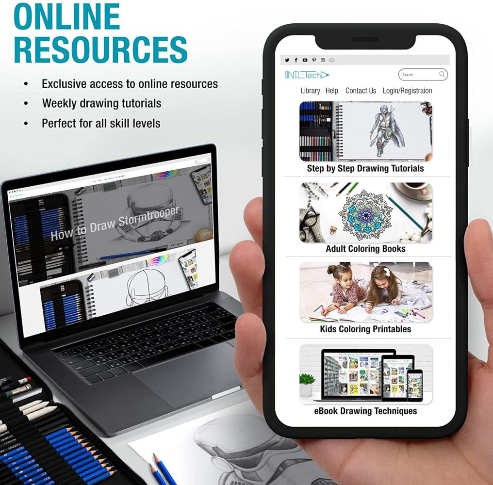 - IMPROVE YOUR ART WITH ONLINE EBOOK LIBRARY - Get access to the online ebook library with NIL Tech’s sketch book and other drawing supplies and learn how to draw your favorite characters with weekly step-by-step drawing tutorials. With over 20 ebooks for every level of expertise and everything from celebrities, anime, and cartoon figures; movie characters like Yoda and Stormtrooper, you'll be able to unlock your drawing talent with these art supplies.