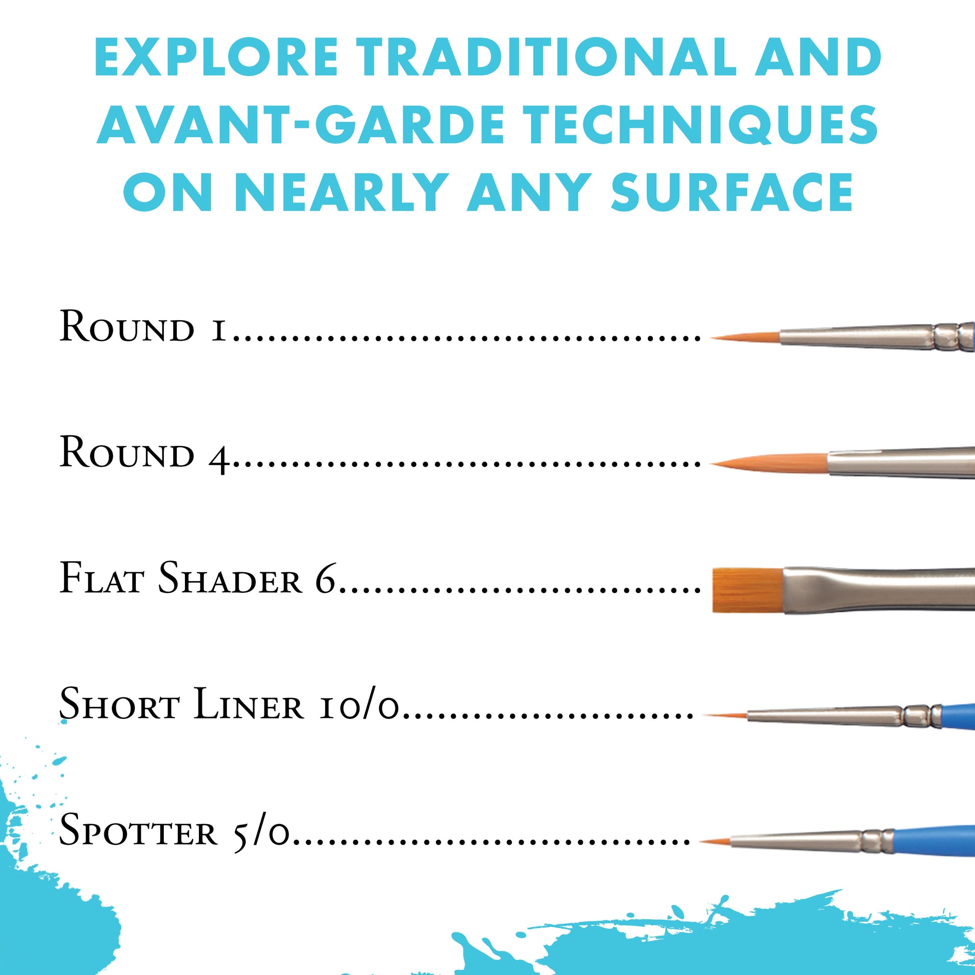 Explore traditional and avant-garde techniques on nearly any surface! Princeton's Select Artiste mixed-media brush sets feature a variety of assortments of brushes that work well together. These quality, short handled brushes are made to last. With their robin's egg blue colored handles, they will be a beautiful addition to your existing brush collection as they go above and beyond basic brush shapes and sizes. This set includes a Round, 1 & 4, Spotter, 5/0, Short Liner, 10/0 & Flat Shader, 6.