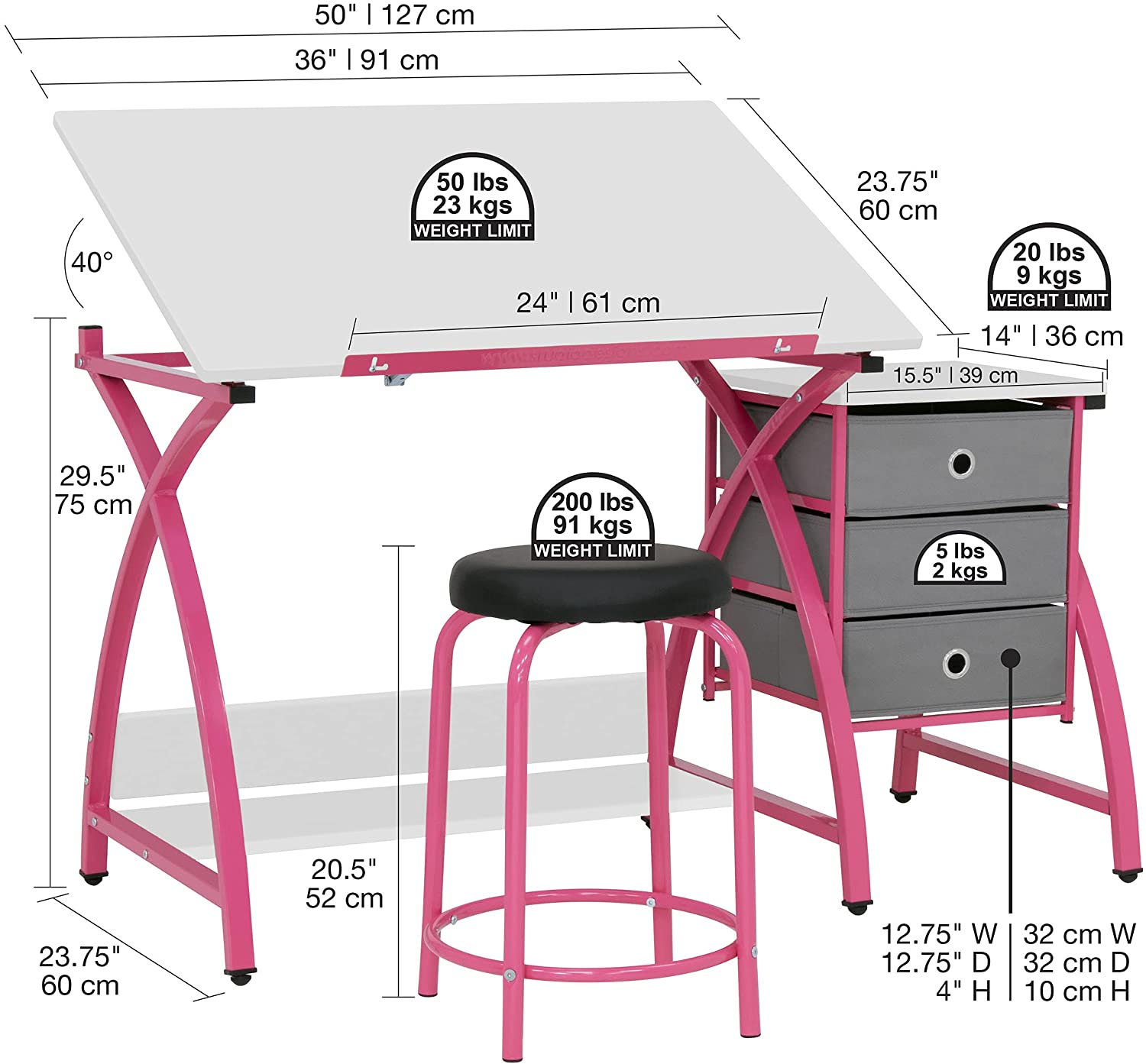 The Venus Craft and Hobby Table with Matching Stool by Studio Designs provides a comfortable work space and keeps your craft and art supplies easily accessible. The table top's angle adjusts up to 40 degrees and includes a 24"pencil ledge that slides up and locks into place when needed. The set also features three adjacent storage drawers, a wide shelf under the table top and a padded stool. The durable heavy gauge steel construction includes six floor levelers for stability. Main work surface: 36"W x 23.75"D. Overall dimension: 50"W x 23.75"D x 29.5"H