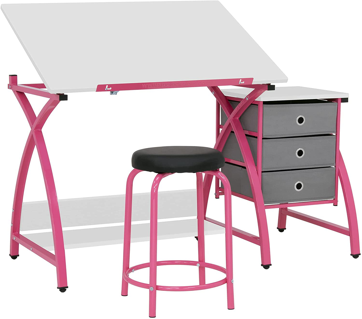 - SIDE SHELF + DRAWERS: The 15.5" W x 14" D side table top keeps your craft supplies close and flat while the top is tilted for drawing. The three fabric drawers offer you a 12.75" W x 12.75" D x 4" H space to organize your art supplies. Larger craft supplies can be stored on the 15.5" wide x 14.25" deep bottom shelf