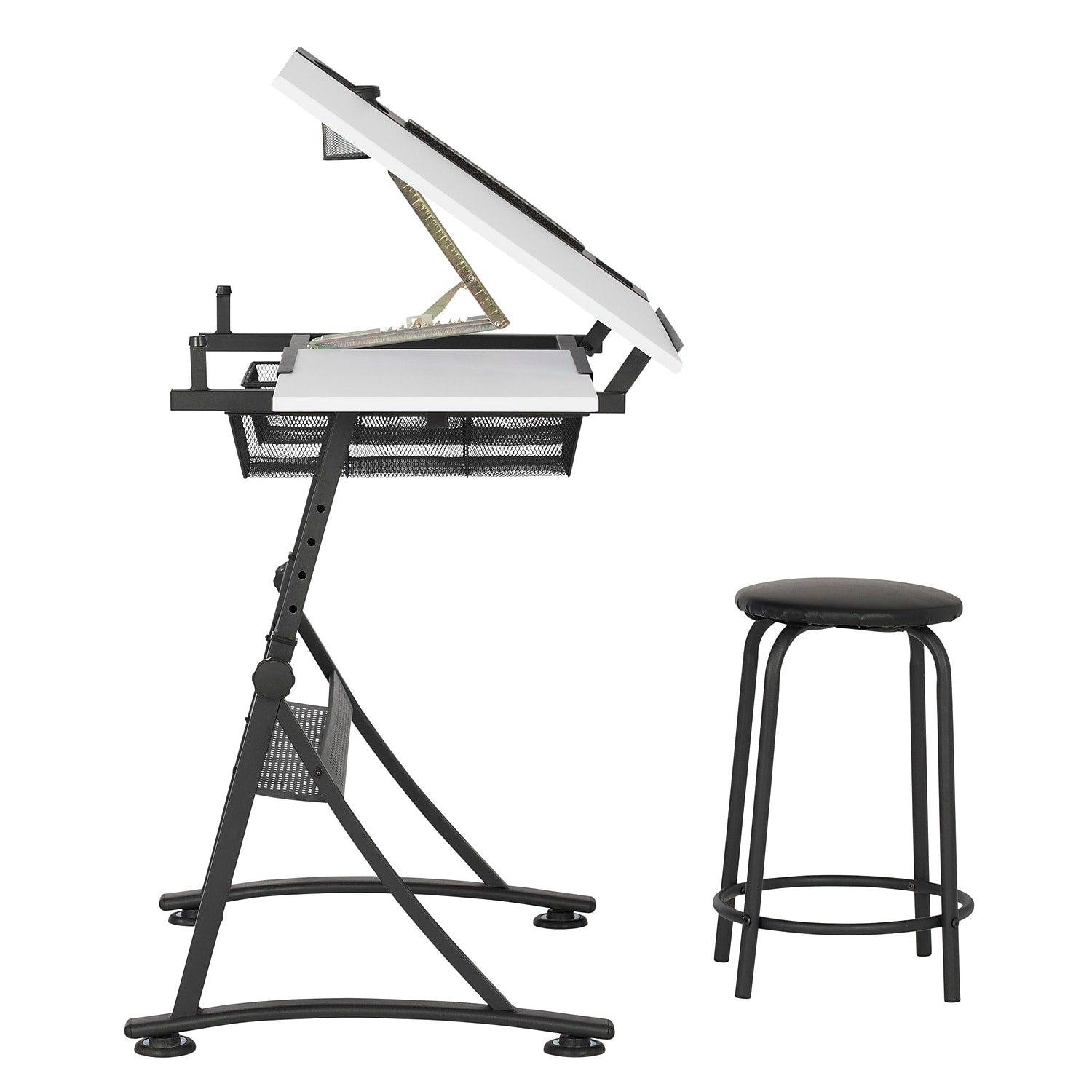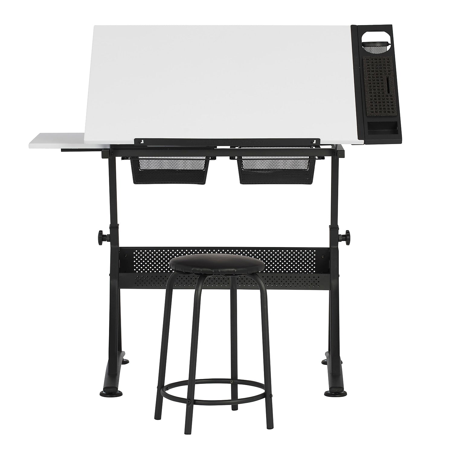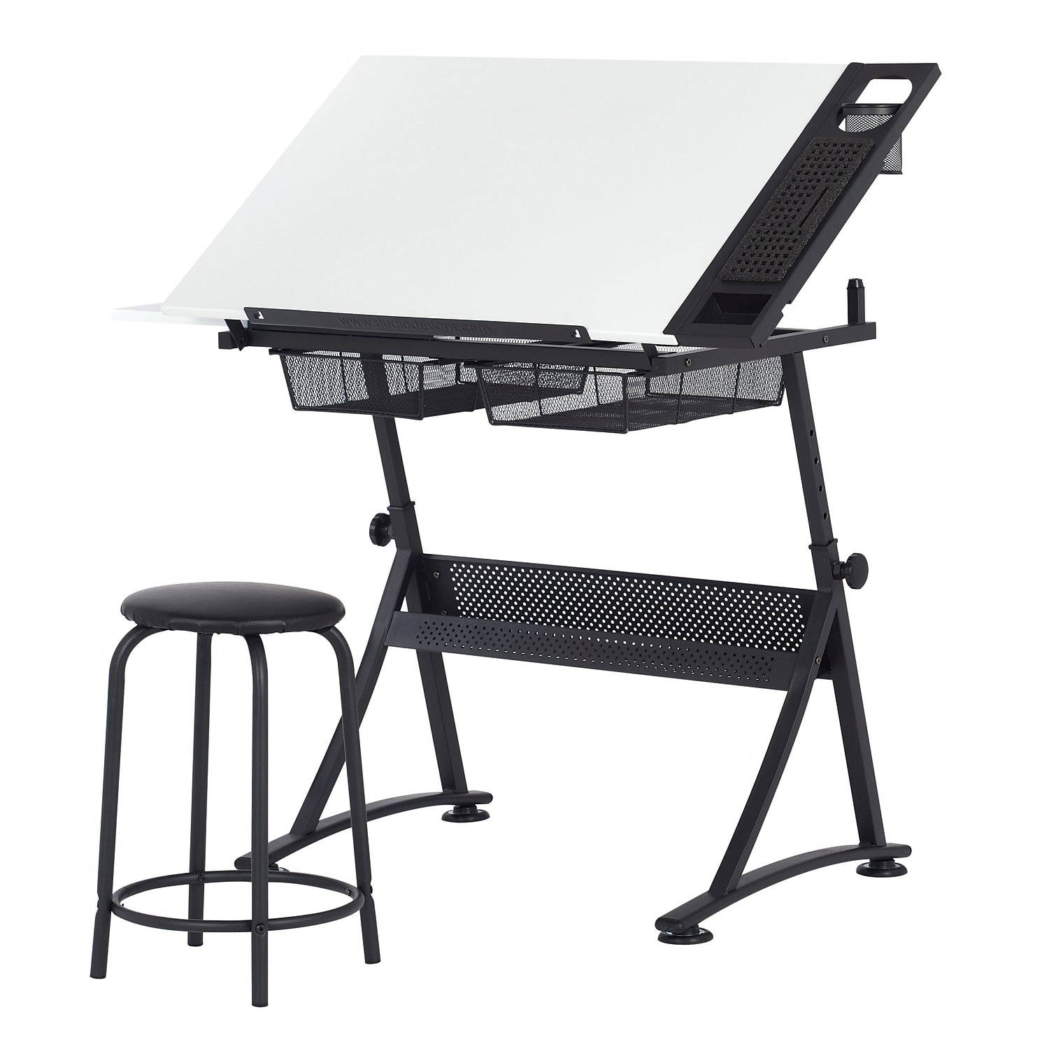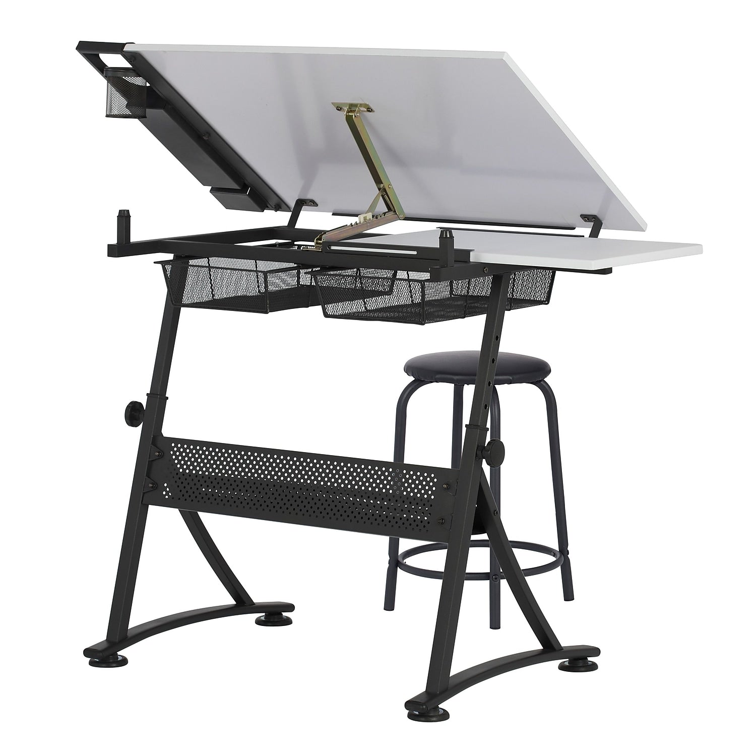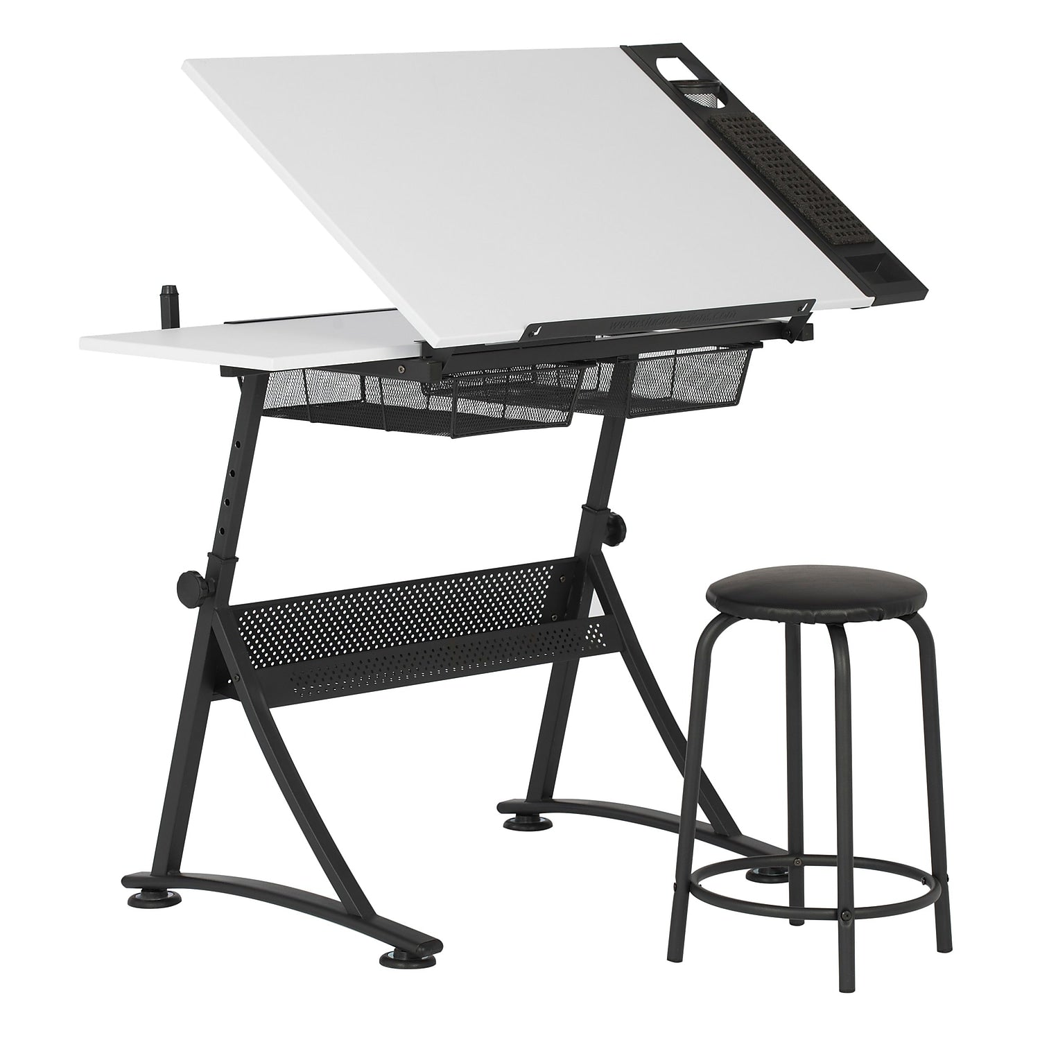 - Top Dimensions: 35.25"" W x 23.75"" D with Angle adjustment from Flat to 60 Degrees. Slide-Out Side Shelf provides Extra Workspace and Two Wire Mesh Storage Drawers. Maximum weight capacity limit -Top: 50 lbs. Side Shelf: 15 lbs. Bottom Shelf: 15 lbs. Stool: 175 lbs.