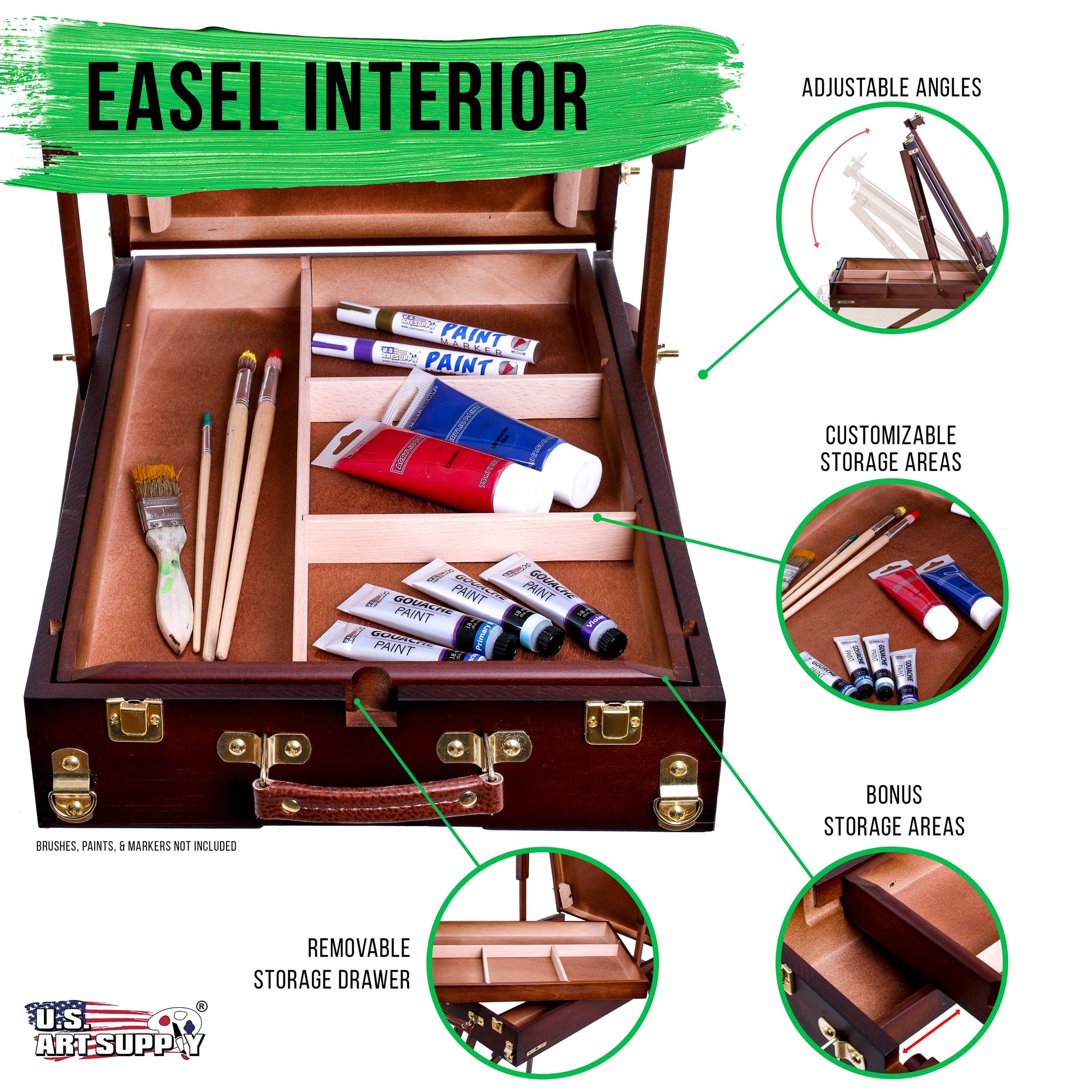 - Features a sliding drawer with divided compartments & an artist's wooden palette