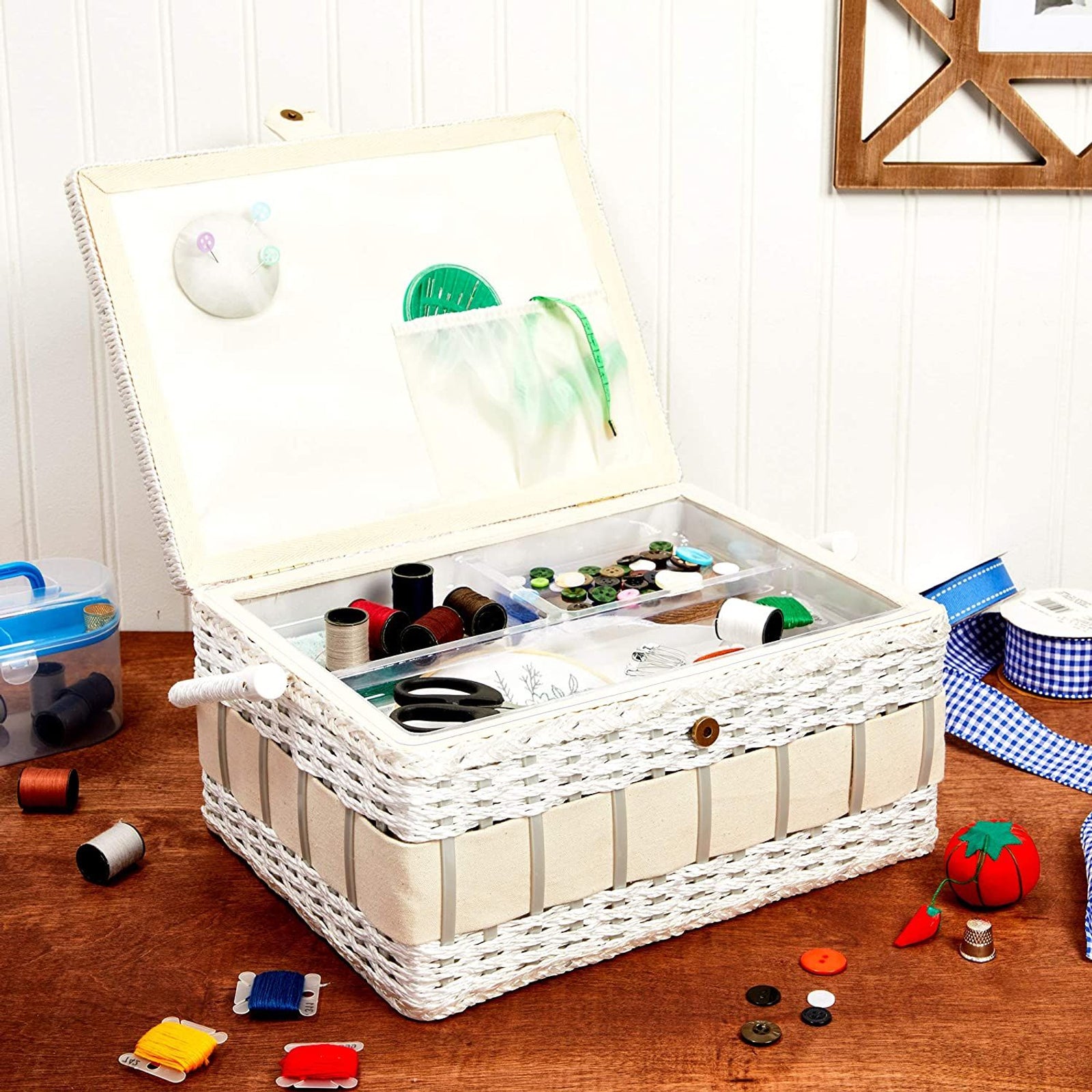 - Organizer Basket: Our sewing basket is crafted with fabric that is vintage inspired; a button fastener holds the basket lid closed while a durable internal plastic storage tray helps organize sewing supplies